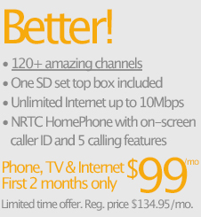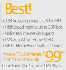 Bundles currently available in Beachburg, Westmeath, Lapasse and selected areas in Pembroke. Long-distance with these bundles is 4¢ per minute, 24 hours a day anywhere in North America. Installation and activation is currently waived with a 12-month contract for new or current customers upgrading to the Better, Best or Ultimate plans. Prices based on installation of 1 TV. Extra TV installation $50 each. Extra set top box $5.00/month. NRTC HD hardware required to view HD content on your HD TV. On-screen Caller ID requires selection of Caller ID as a phone calling feature. Download speeds can vary depending on a variety of factors. All prices are subject to change without notice and do not include long distance or taxes.